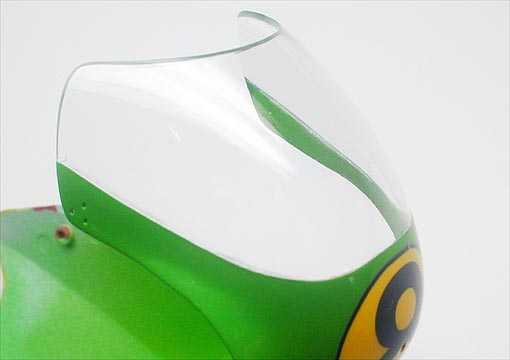 ![]() 最初にスクリーンを瞬間接着剤でカウルに接着。 カウルと一緒に成型し、コンパウンドで研ぎだします。 スクリーンの内側は傷が付くとやっかいなので 保護のためマスキングゾルを塗っています。 カウルの先端の形状をパテで変更しています。 |