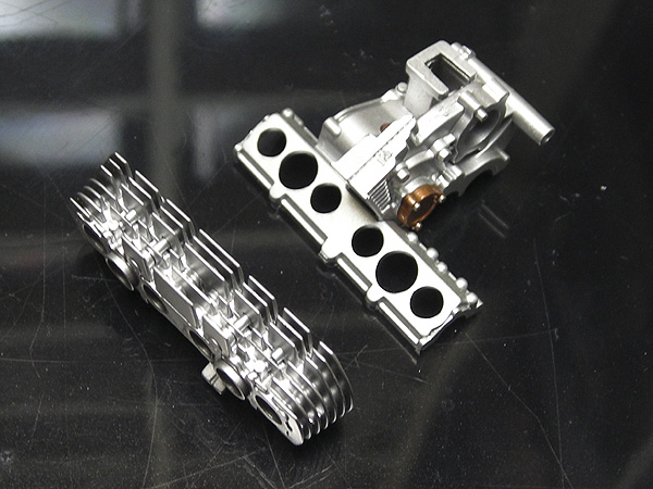 おお、6気筒。 挽き物ファンネルの中心部は艶消し黒を塗っています。 クラッチはシャフトがポリキャップでとまっているだけなので回転します。 シャリシャリって音はでません。 |