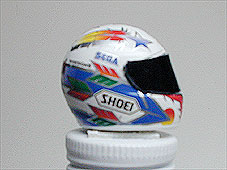 ヘルメットのモールドを深く筋彫りします。 デカールはできるだけ細かく切り刻んで貼っていきます。 そこらに転がっているギフトの箱なんかに付いてる 塩ビを切り出し、スモーク塗装してつけます。 顔は適当に塗っておきます。 次にメットの底をえぐって、2液タイプのエポキシボンドを流し込み、髪の毛を植え付けます。 出来上がったメットを胴体に接着します。 少し右がわにオフセットして、取り付けるとノリックらしさがでます。 髪の毛を散髪して短くします。 実際ノリックの髪の毛はメットからでていないんですが、モケイなんでおおげさに。 車体は、ハンドルやステップはハンダで溶接したホワイトメタルのモノを使ったほうが良いでしょう。 ポキポキ折れてしましますから。 |